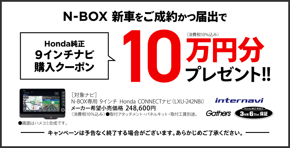 ●N-BOXシリーズ(CUSTOM・JOY含む)を新車でご成約かつ届出いただいた方が対象となります。 ●クーポンご利用のナビはご成約いただいた車両に取り付けさせていただきます。 ●クーポンはご成約いただきました販売店でのみ有効です。 ●クーポンは対象車種のN-BOX専用 9インチ Honda CONNECTナビにご利用いただけます。 ●ナビの在庫状況によっては適用にならない場合がございます。 ●クーポン金額を超える代金、取付アタッチメント、パネルキット、取付工賃はご成約者様のご負担とさせていただきます。 ●当キャンペーン権利の他人への譲渡や換金、値引きはできません。 ●他のキャンペーンと併用できない場合があります。 ●価格はメーカー希望小売価格(消費税10%込み)で参考価格です。販売価格は販売会社が独自に定めております。 ●本キャンペーンは愛知・三重・岐阜・富山・石川・福井県内のHonda Cars店にて実施しております。 ●一部のタイプ、カラーによっては届出に時間を要するため対象とならない場合がございます。 ●詳しくは販売会社までお問い合わせください。