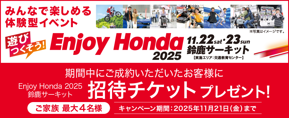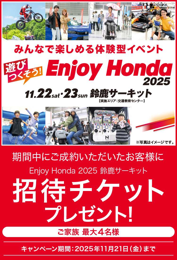●期間中に試乗・査定・商談いただいた方が対象となります。 ●招待チケットの換金・譲渡、他の景品との引換えはできません。 ●本キャンペーンは当店にて実施しております。 ●招待チケットは1枚につき1名様まで入場いただけます。(3歳未満のお子様は無料でご入場いただけます。) ●招待チケット1枚につき1名の方有効で、11/22(土)・23(日)の鈴鹿サーキットパークへの入場および、レーシングコース自由席でのレース観戦が可能です。 ●招待チケットにて、11/22(土)・23(日)に限り、パークパスポート(アトラクション乗り放題:一部機種除く)として、ご利用いただけます。 ●招待チケットの払い戻し、変更、盗難、紛失、破損、汚損など事情に関わらず再発行はいたしかねます。 ●招待チケットは興行不成立の場合でも払い戻しはございません。また、代替日程でレース開催の場合でも招待チケットは使用できませんので予めご了承ください。 ●都合により相応な範囲で当日の内容を一部変更する場合がございます。 ●悪天候などの理由により、プログラム変更となる場合があります。 ●招待チケットの営利目的とした転売は、いかなる場合もお断りいたします。 ●他のキャンペーンと併用できない場合がございます。 ●会場までの交通費、駐車料金及び個人的な費用はご本人様の負担となります。 ●写真はイメージです。 ●招待チケットの数には限りがあります。 ●詳しくは販売会社までお問い合わせください。
