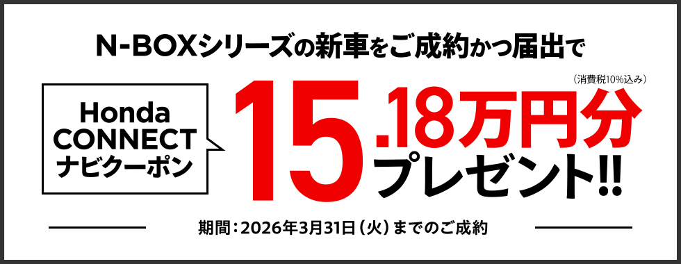 ●N-BOX(CUSTOM/JOY含む)を新車でご成約かつ届出いただいた方が対象となります。 ●クーポンはご成約いただいた販売店でのみ有効です。 ●ナビの種類・在庫状況によっては適用にならない場合がございます。 ●工賃・取付アタッチメント費はご成約者様のご負担となる場合がございます。 ●クーポン金額を超える代金は、ご成約者様のご負担とさせていただきます。また、総額がクーポン金額に満たない場合の返金、値引きはありません。 ●当キャンペーン権利の他人への譲渡や換金、値引きはできません。 ●プレゼントはご成約された車を対象として取付けします。 ●他のキャンペーンと併用できない場合があります。 ●クーポンは対象車種のHonda CONNECTナビにご利用いただけます。 ●一部のタイプ、カラーによっては届出に時間を要するため対象とならない場合がございます。 ●詳しくは販売会社までお問い合わせください。