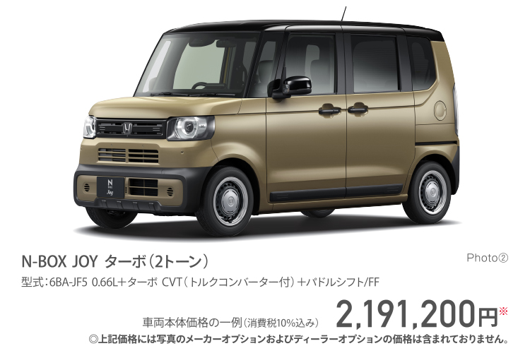 N-BOX Photo①:N-BOX JOY ターボ(FF/2トーン) ボディーカラーはデザートベージュ・パール&ブラック メーカーオプション(マルチビューカメラシステム 72,600円高)、ディーラーオプション(N-BOX専用 9インチ Honda CONNECTナビ LXU-242NBi[取付アタッチメント、パネルキット含む]259,600円[取付工賃別途])装着車 ②:N-BOX JOY ターボ(FF/2トーン) ボディーカラーはデザートベージュ・パール&ブラック ③:N-BOX(FF) ボディーカラーはプラチナホワイト・パール(有料色:33,000円高)