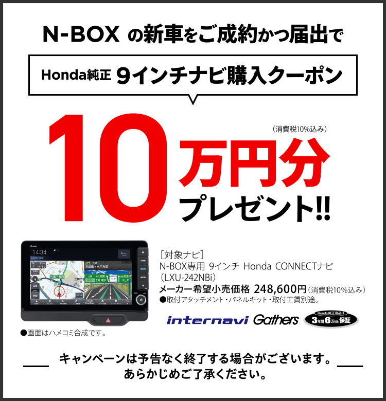 ●N-BOXシリーズ(CUSTOM・JOY含む)を新車でご成約かつ届出いただいた方が対象となります。 ●クーポンご利用のナビはご成約いただいた車両に取り付けさせていただきます。 ●クーポンはご成約いただきました販売店でのみ有効です。 ●クーポンは対象車種のN-BOX専用 9インチ Honda CONNECTナビにご利用いただけます。 ●ナビの在庫状況によっては適用にならない場合がございます。 ●クーポン金額を超える代金、取付アタッチメント、パネルキット、取付工賃はご成約者様のご負担とさせていただきます。 ●当キャンペーン権利の他人への譲渡や換金、値引きはできません。 ●他のキャンペーンと併用できない場合があります。 ●価格はメーカー希望小売価格(消費税10%込み)で参考価格です。販売価格は販売会社が独自に定めております。 ●本キャンペーンは愛知・三重・岐阜・富山・石川・福井県内のHonda Cars店にて実施しております。 ●一部のタイプ、カラーによっては届出に時間を要するため対象とならない場合がございます。 ●詳しくは販売会社までお問い合わせください。