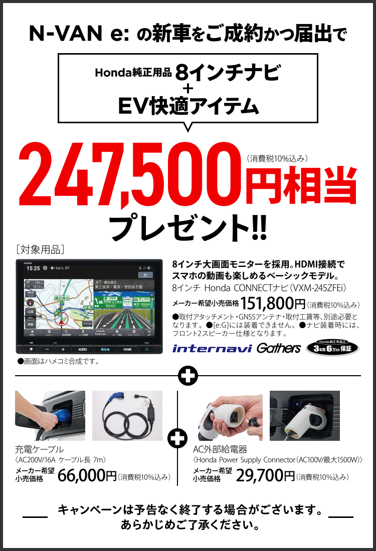 ●N-VAN e:を新車でご成約かつ届出いただいた方が対象となります。 ●クーポンご利用の用品はご成約いただいた車両に取り付けさせていただきます。 ●クーポンはご成約いただきました販売店でのみ有効です。 ●クーポンは対象車種の8インチ Honda CONNECTナビ・充電ケーブル・AC外部給電器にご利用いただけます。 ●用品の在庫状況によっては適用にならない場合がございます。 ●クーポン金額を超える代金、取付アタッチメント、GNSSアンテナ、取付工賃はご成約者様のご負担とさせていただきます。 ●当キャンペーン権利の他人への譲渡や換金、値引きはできません。 ●他のキャンペーンと併用できない場合があります。 ●価格はメーカー希望小売価格(消費税10%込み)で参考価格です。販売価格は販売会社が独自に定めております。 ●充電機器・給電機器を操作する際は取扱説明書をご確認いただき正しくお使いください。 ●給電機器で医療用電子機器を使用する際は、機器メーカー・医師等に事前にご相談ください。 ●本キャンペーンは愛知・三重・岐阜・富山・石川・福井県内のHonda Cars店にて実施しております。 ●一部のタイプ、カラーによっては届出に時間を要するため対象とならない場合がございます。 ●詳しくは販売会社までお問い合わせください。