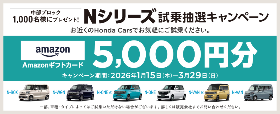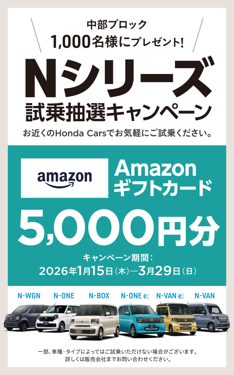 ●対象地区:愛知県・三重県・岐阜県・静岡県・富山県・石川県・福井県のHonda Cars ●キャンペーン期間中に左記対象のHonda Carsへご来店いただき対象車種にご試乗いただいた方の中から抽選で、1,000名様にAmazonギフトカード5,000円分をプレゼントいたします。 ●キャンペーン終了後、厳正なる抽選のうえ当選された方には4月下旬ごろキャンペーン事務局よりSMSにてAmazonギフトカード番号を送付いたします。SMSで送付が出来ない場合は、応募時にご入力いただいたメールアドレス宛に送付いたします。SMS、メールいずれでも送付できない場合は当選を無効とさせていただきますので、予め受信拒否設定の解除をお願いいたします。また、ご送付は都合により遅れる場合もございますのであらかじめご了承ください。 ●対象車種:Nシリーズ(N-BOX〈CUSTOM、JOY含む〉、N-WGN、N-ONE、N-ONE e: 、N-VAN、N-VAN e: ) ●ご応募はお一組様につき1回となります。 ●本キャンペーンの権利の他人への譲渡や換金、値引きはできません。 ●他のキャンペーンと併用はできない場合がございます。 ●Amazon、Amazon.co.jpおよびそれらのロゴはAmazon.com, Inc. またはその関連会社の商標です。 ●本キャンペーンは中部ブロックHonda Carsによる提供です。 ●本キャンペーンについてのお問い合わせはAmazonではお受けしておりません。 ●詳しくは販売会社までお問い合わせください。
