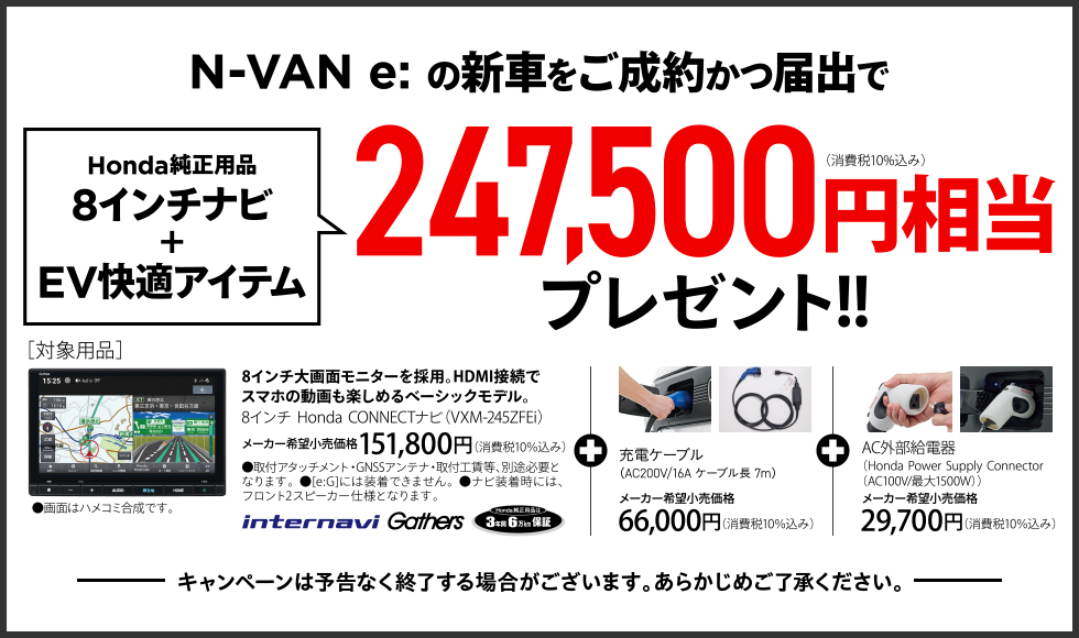 ●N-VAN e:を新車でご成約かつ届出いただいた方が対象となります。 ●クーポンご利用の用品はご成約いただいた車両に取り付けさせていただきます。 ●クーポンはご成約いただきました販売店でのみ有効です。 ●クーポンは対象車種の8インチ Honda CONNECTナビ・充電ケーブル・AC外部給電器にご利用いただけます。 ●用品の在庫状況によっては適用にならない場合がございます。 ●クーポン金額を超える代金、取付アタッチメント、GNSSアンテナ、取付工賃はご成約者様のご負担とさせていただきます。 ●当キャンペーン権利の他人への譲渡や換金、値引きはできません。 ●他のキャンペーンと併用できない場合があります。 ●価格はメーカー希望小売価格(消費税10%込み)で参考価格です。販売価格は販売会社が独自に定めております。 ●充電機器・給電機器を操作する際は取扱説明書をご確認いただき正しくお使いください。 ●給電機器で医療用電子機器を使用する際は、機器メーカー・医師等に事前にご相談ください。 ●本キャンペーンは愛知・三重・岐阜・富山・石川・福井県内のHonda Cars店にて実施しております。 ●一部のタイプ、カラーによっては届出に時間を要するため対象とならない場合がございます。 ●詳しくは販売会社までお問い合わせください。