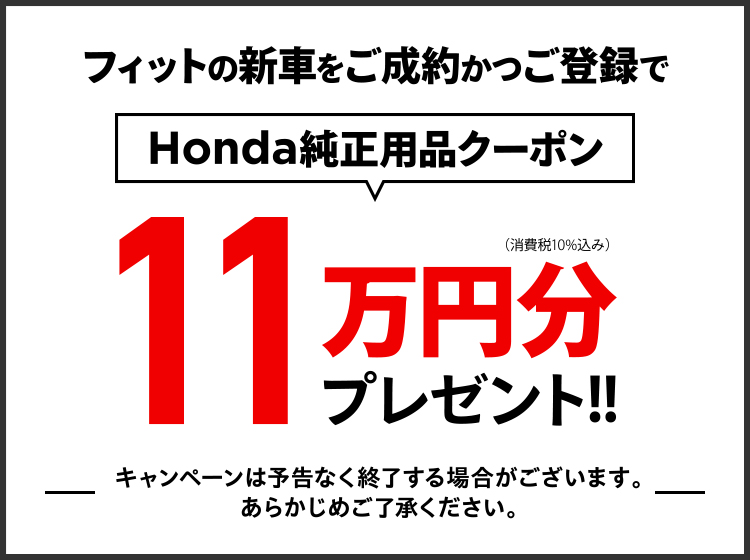 ●フィットを新車でご成約かつご登録いただいた方が対象となります。 ●クーポンはご成約いただいた販売店でのみ有効です。 ●クーポンは対象車種のHonda純正アクセサリー車種サイトに掲載されているHonda純正用品(Hondaカーケアメニュー、ケミカル用品〈一部〉除く)にご利用いただけます。 ●工賃・取付アタッチメント費はご成約者様のご負担となる場合がございます。 ●クーポン金額を超える代金は、ご成約者様のご負担とさせていただきます。また、総額がクーポン金額に満たない場合の返金、値引きはありません。 ●当キャンペーン権利の他人への譲渡や換金、値引きはできません。 ●他のキャンペーンと併用できない場合があります。 ●一部のタイプ、カラーによっては登録に時間を要するため対象とならない場合がございます。 ●詳しくは販売会社までお問い合わせください。