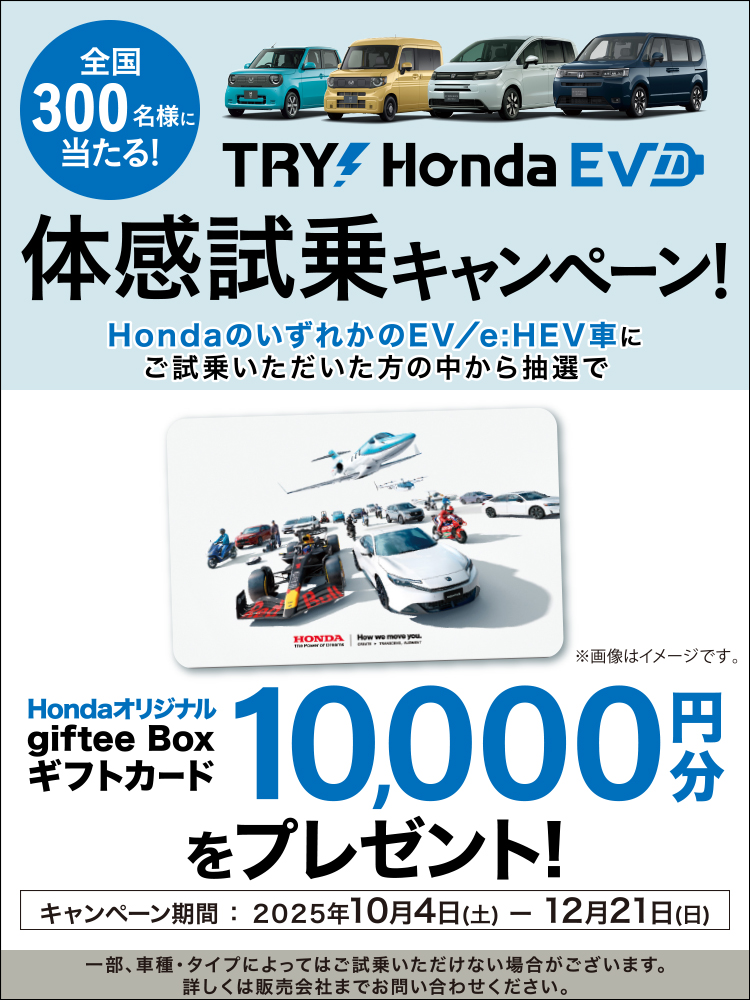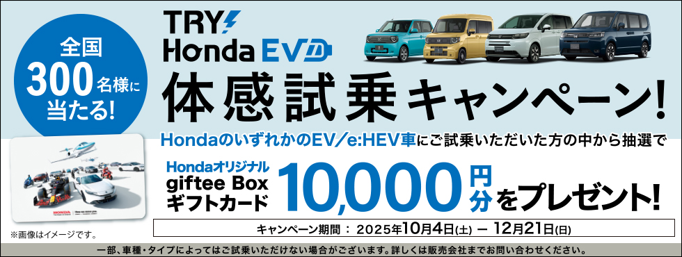 ●対象:全国のHonda Cars ●キャンペーン期間中に対象のHonda Carsへご来店いただき対象車種にご試乗後、専用フォームからご応募いただいた方の中から抽選で300名様にラインアップの中からお好きな商品と交換できるgiftee Boxのギフトカード1万円分をプレゼントいたします。 ●キャンペーン終了後、厳正なる抽選のうえ当選された方には2026年1月下旬ごろキャンペーン事務局よりご自宅へ景品を配送いたします。都合により遅れる場合もございますのであらかじめご了承ください。 ●対象車種:HondaのいずれかのEV/e:HEV車 ●ご応募はお一組様につき1回となります。 ●本キャンペーンの権利の他人への譲渡や換金、値引きはできません。 ●他のキャンペーンと併用はできない場合がございます。 [giftee Boxについてのご注意事項] ●ラインアップの中から好きな商品と交換していただけます。 ●ポイント数は受け取ったチケット券面をご確認ください。 ●ラインアップおよび交換に必要なポイントは付与されたギフトにより異なり、変更になる場合がございます。 ●ポイント交換レートは商品により異なります。記載された必要ポイント数をよくご確認の上、商品と交換してください。 ●選択された商品によって、giftee Box1ポイントにつき1円相当とならない場合がございます。また、交換レートを含む商品内容は今後予告なく変更する場合がございます。 ●詳しくは販売会社までお問い合わせください。