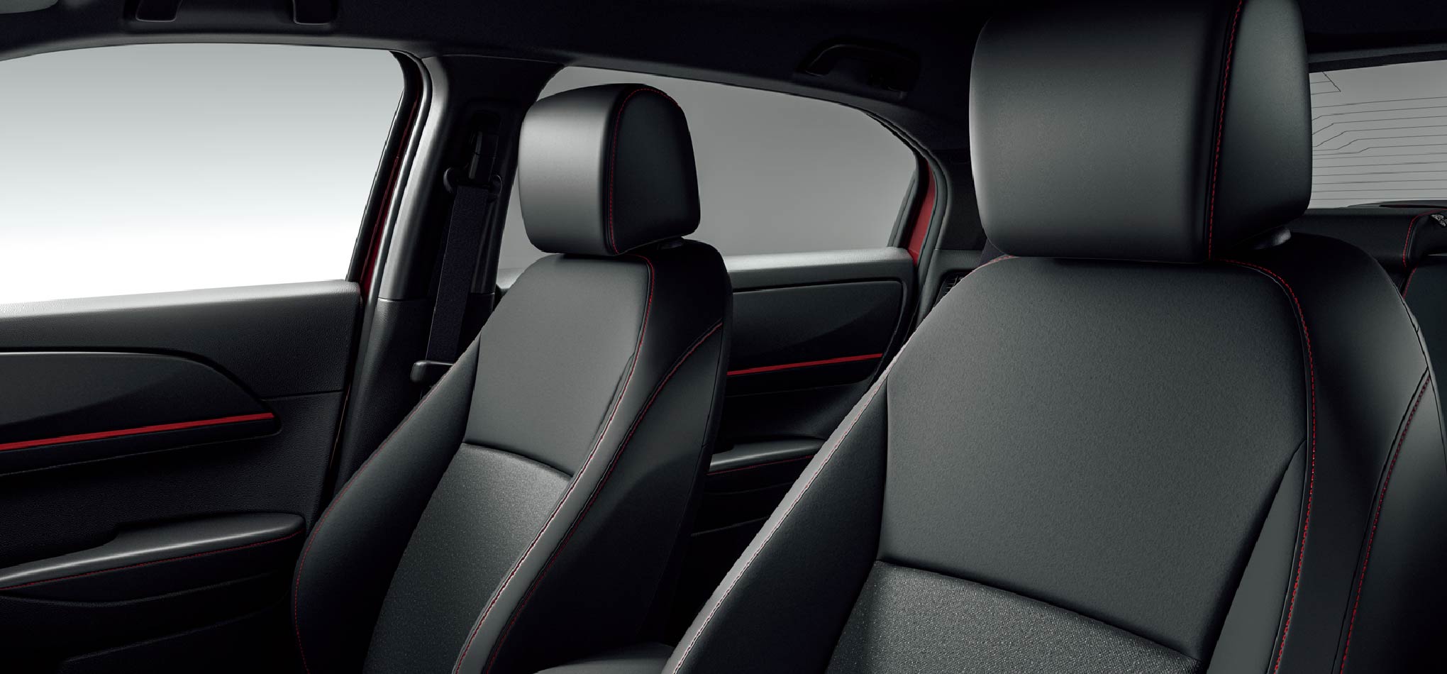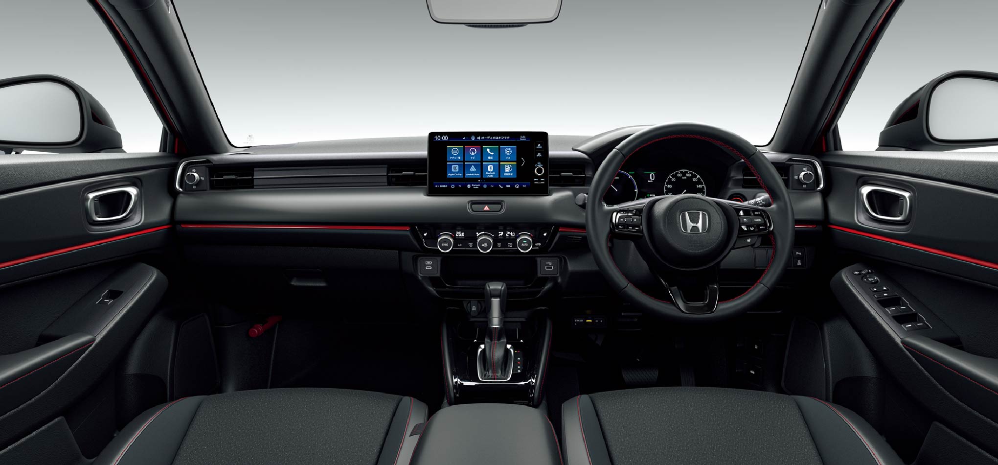 Photo①: VEZEL e:HEV RS(FF) ボディーカラーはプレミアムクリスタルレッド・メタリック ■インテリアのルーフライニングおよびピラーの色はブラックとなります。■メーター類は撮影のため点灯。■画面はハメコミ合成。Photo②: VEZEL e:HEV RS(FF) ボディーカラーはプレミアムクリスタルレッド・メタリック ■インテリアのルーフライニングおよびピラーの色はブラックとなります。