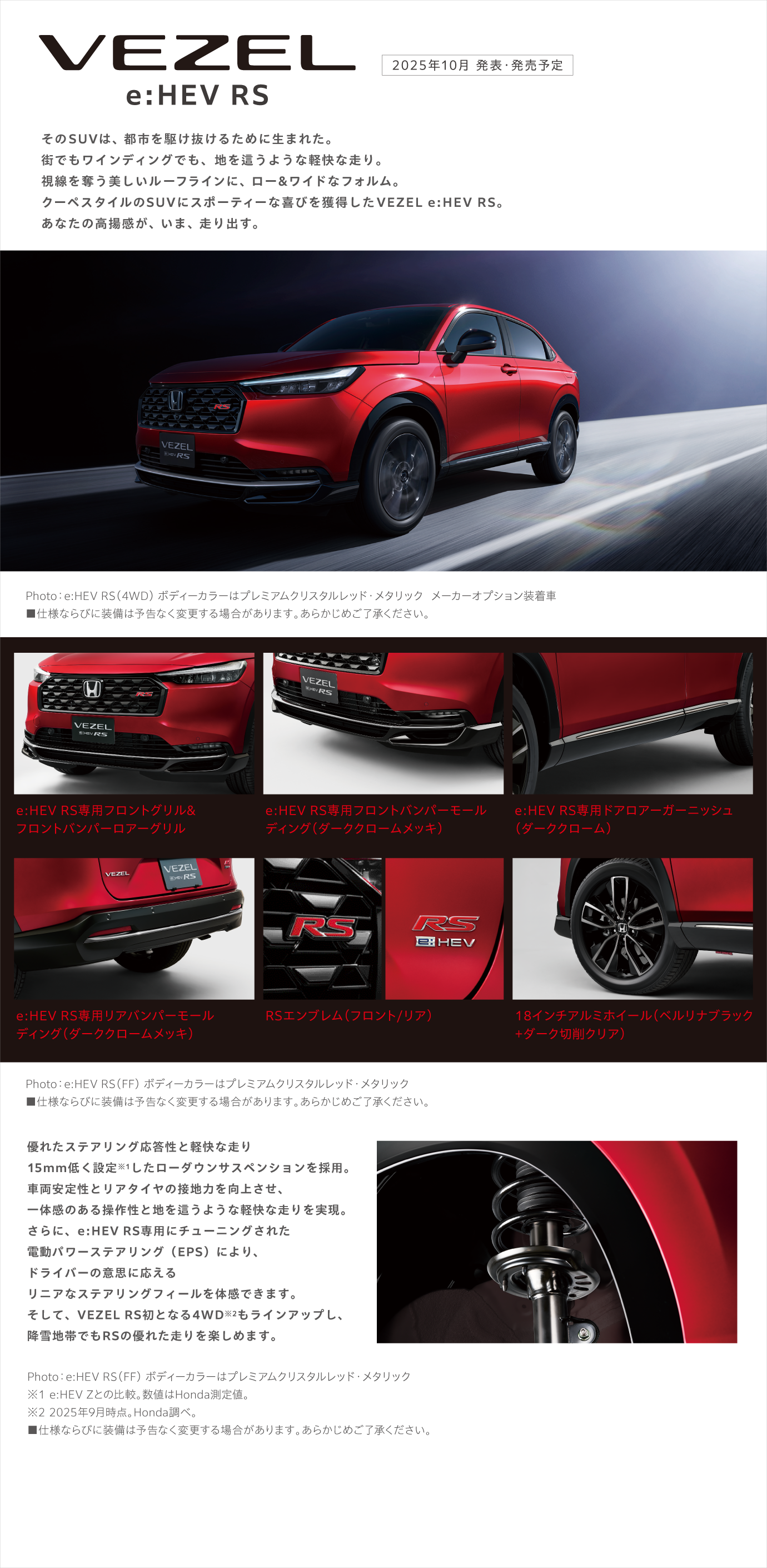 Photo①②③:ヴェゼル e:HEV Z(FF) ボディーカラーはプラチナホワイト・パール(有料色:38,500円高)メーカーオプション(後退出庫サポート、Honda CONNECTディスプレー+ETC2.0車載器〈ナビゲーション連動〉、ワイヤレス充電器、マルチビューカメラシステム、プレミアムオーディオはセットで347,600円高)装着車 ■メーター類は撮影のため点灯。■画面はハメコミ合成。●ETC2.0車載器を使用するには、別途決済用のETCカード、セットアップ作業(セットアップ費用)が必要となります。
