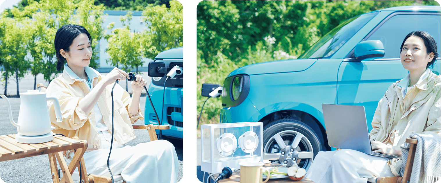 Photo 2点: N-ONE e: L ボディーカラーはチアフルグリーン ディーラーオプション(AC外部給電器〈Honda Power Supply Connector〉AC100V/最大1500W)装着車 ■外部給電には別途、ディーラーオプションのAC外部給電器「Honda Power Supply Connector」が必要です。■小物類は撮影のために用意したものです。