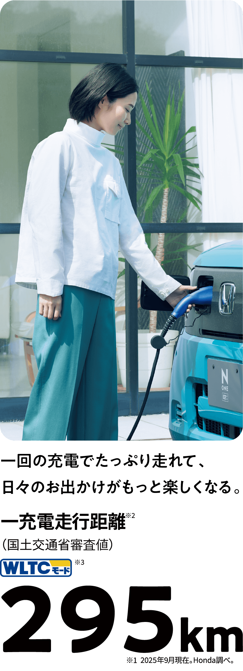 Photo: N-ONE e: L ボディーカラーはチアフルグリーン ディーラーオプション(充電ケーブル AC200V/16A ケーブル長15m)装着車 ■写真の充電ケーブルはディーラーオプション。 ※ 2 一充電走行距離は定められた試験条件での値です。お客様の使用環境(気象、渋滞等)や運転方法(急発進、エアコン使用等)に応じて一充電走行距離は大きく異なります。※ 3 WLTCモード:市街地、郊外、高速道路の各走行モードを平均的な使用配分で構成した国際的な走行モード。