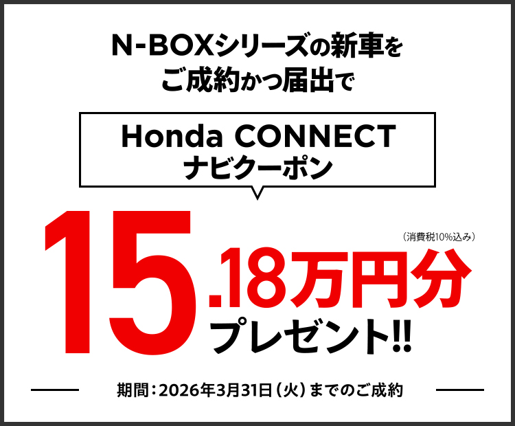 ●N-BOX(CUSTOM/JOY含む)を新車でご成約かつ届出いただいた方が対象となります。 ●クーポンはご成約いただいた販売店でのみ有効です。 ●ナビの種類・在庫状況によっては適用にならない場合がございます。 ●工賃・取付アタッチメント費はご成約者様のご負担となる場合がございます。 ●クーポン金額を超える代金は、ご成約者様のご負担とさせていただきます。また、総額がクーポン金額に満たない場合の返金、値引きはありません。 ●当キャンペーン権利の他人への譲渡や換金、値引きはできません。 ●プレゼントはご成約された車を対象として取付けします。 ●他のキャンペーンと併用できない場合があります。 ●クーポンは対象車種のHonda CONNECTナビにご利用いただけます。 ●一部のタイプ、カラーによっては届出に時間を要するため対象とならない場合がございます。 ●詳しくは販売会社までお問い合わせください。