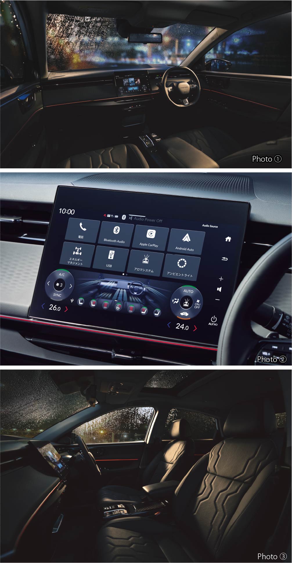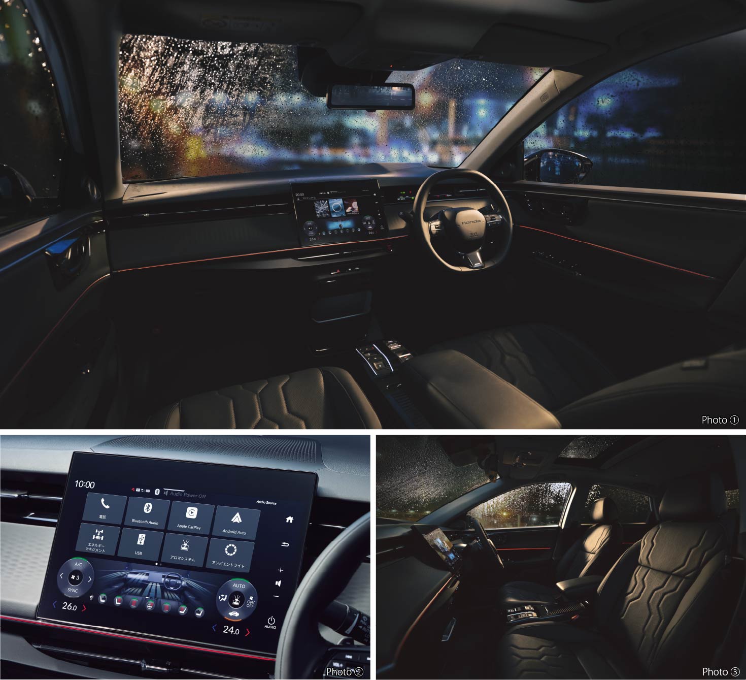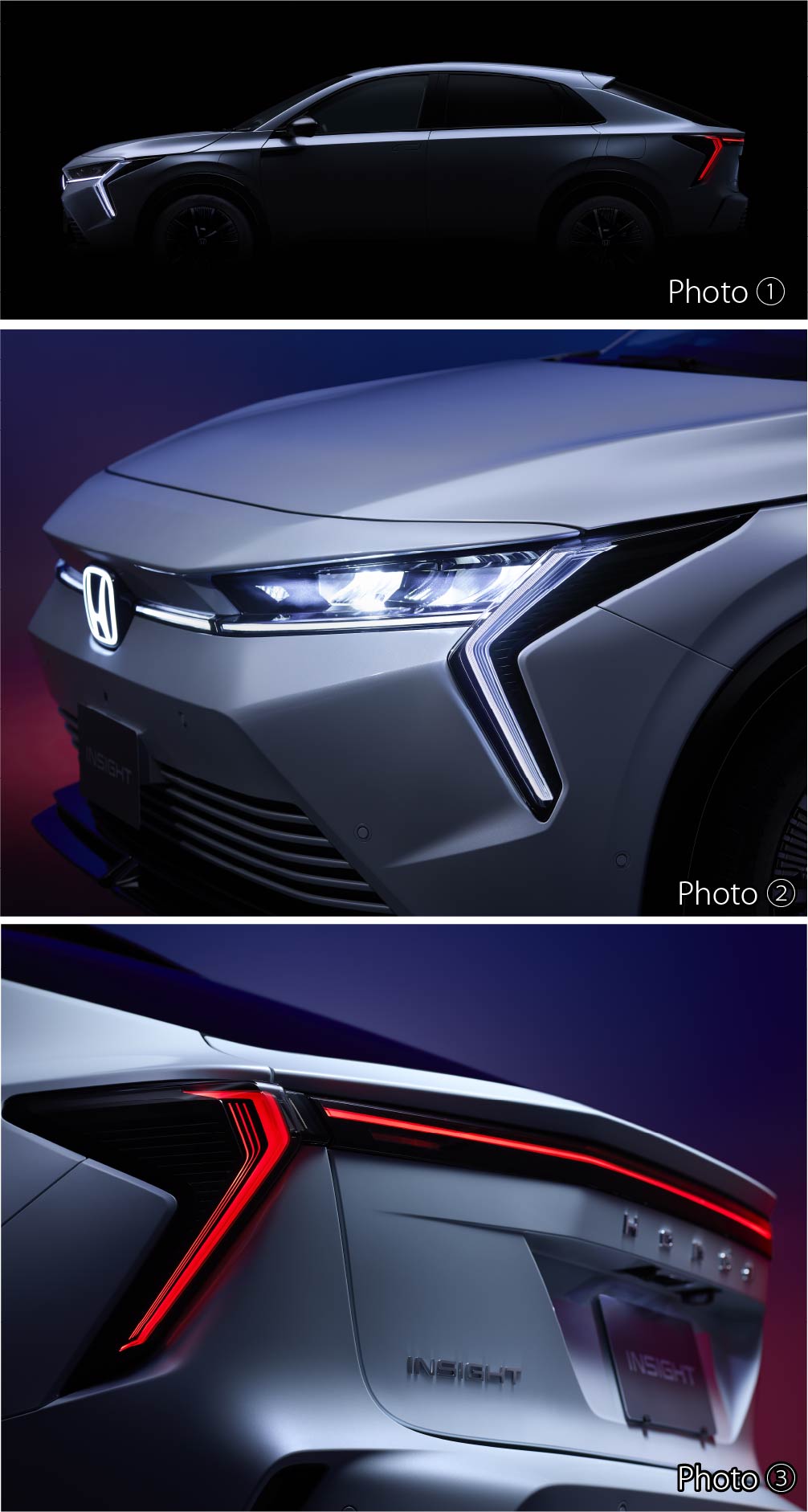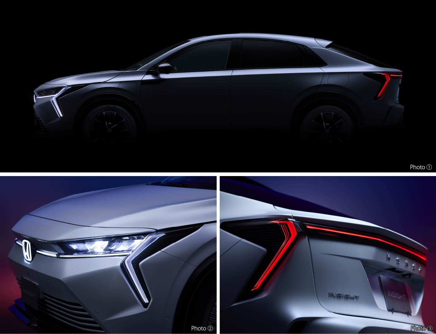 Photo①③:INSIGHT(FF) ボディーカラーはダイヤモンドダスト・パール インテリアカラーはブラック ■写真のメーター類、ランプ類、ディスプレーは撮影のため点灯。 ■画面、表示はハメコミ合成。Photo②:INSIGHT(FF) インテリアカラーはブラック ■写真のランプ類、ディスプレーは撮影のため点灯。■画面はハメコミ合成