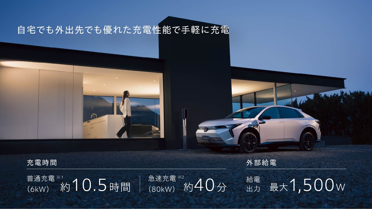Photo : INSIGHT(FF) ボディーカラーはダイヤモンドダスト・パール ※1:普通充電は、充電残量警告灯が点灯した時点から、満充電までのおおよその時間。※2: 急速充電は、充電残量警告灯が点灯した時点から、充電量80%までのおおよその時間(特に、夏季・冬季には充電時間が長くなる場合があります)。 ■充電器の仕様、周辺の環境温度、バッテリーの残量、車両の状況によって充電時間や充電可能容量が異なる場合があります。 ■ご自宅や事業所などで充電する場合、充電設備が必要となります。 ■外部給電には別途、ディーラーオプションのAC外部給電器「Honda Power Supply Connector」が必要です。