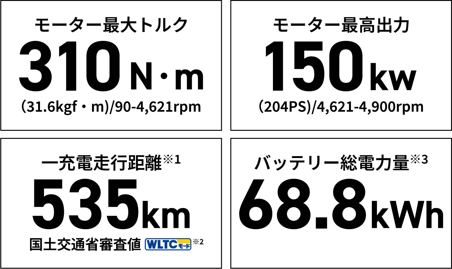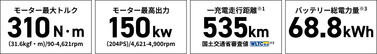 ※1 一充電走行距離は定められた試験条件での値です。お客様の使用環境(気象、渋滞等)や運転方法(急発進、エアコン使用等)に応じて一充電走行距離は大きく異なります。 ※2 WLTCモード:市街地、郊外、高速道路の各走行モードを平均的な使用時間配分で構成した国際的な走行モード。 ※3 総電力量は、車両に搭載した電池のエネルギー量を表しています。国連危険物輸送勧告の定義に基づき算出した値であり、電圧(V)と容量(Ah)、セル数によって求められます。