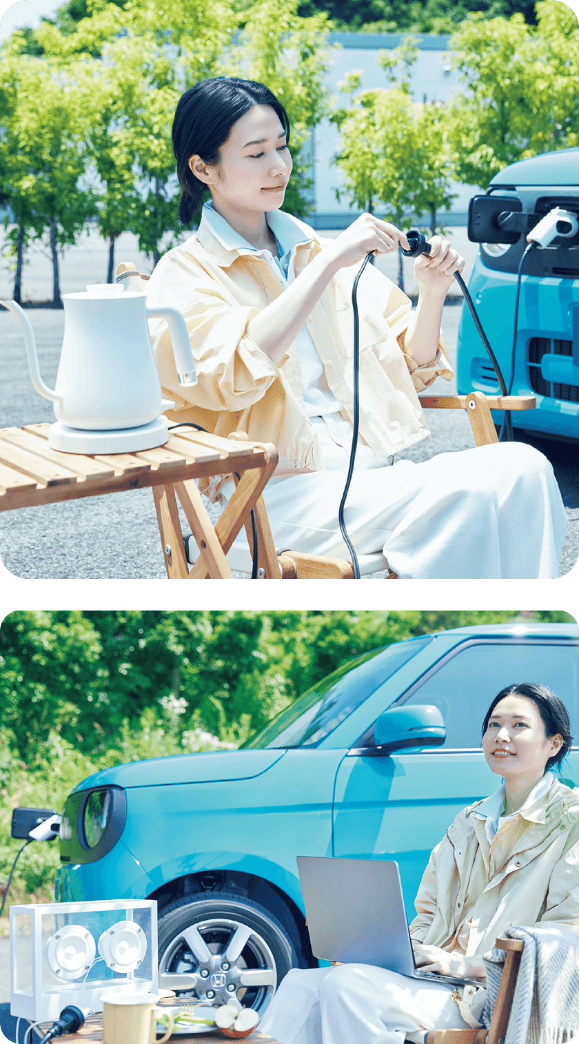 Photo 2点: N-ONE e: L ボディーカラーはチアフルグリーン ディーラーオプション(AC外部給電器〈Honda Power Supply Connector〉AC100V/最大1500W)装着車 ■外部給電には別途、ディーラーオプションのAC外部給電器「Honda Power Supply Connector」が必要です。■小物類は撮影のために用意したものです。