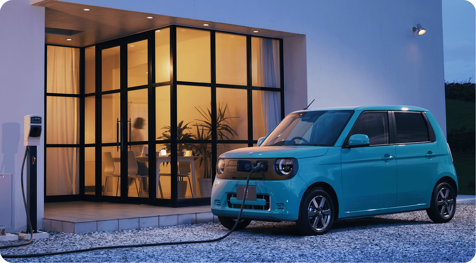 Photo : N-ONE e: L ボディーカラーはチアフルグリーン ■V2Hには別途、V2H機器と設置工事が必要です。■V2H機器は撮影のために用意したものです。