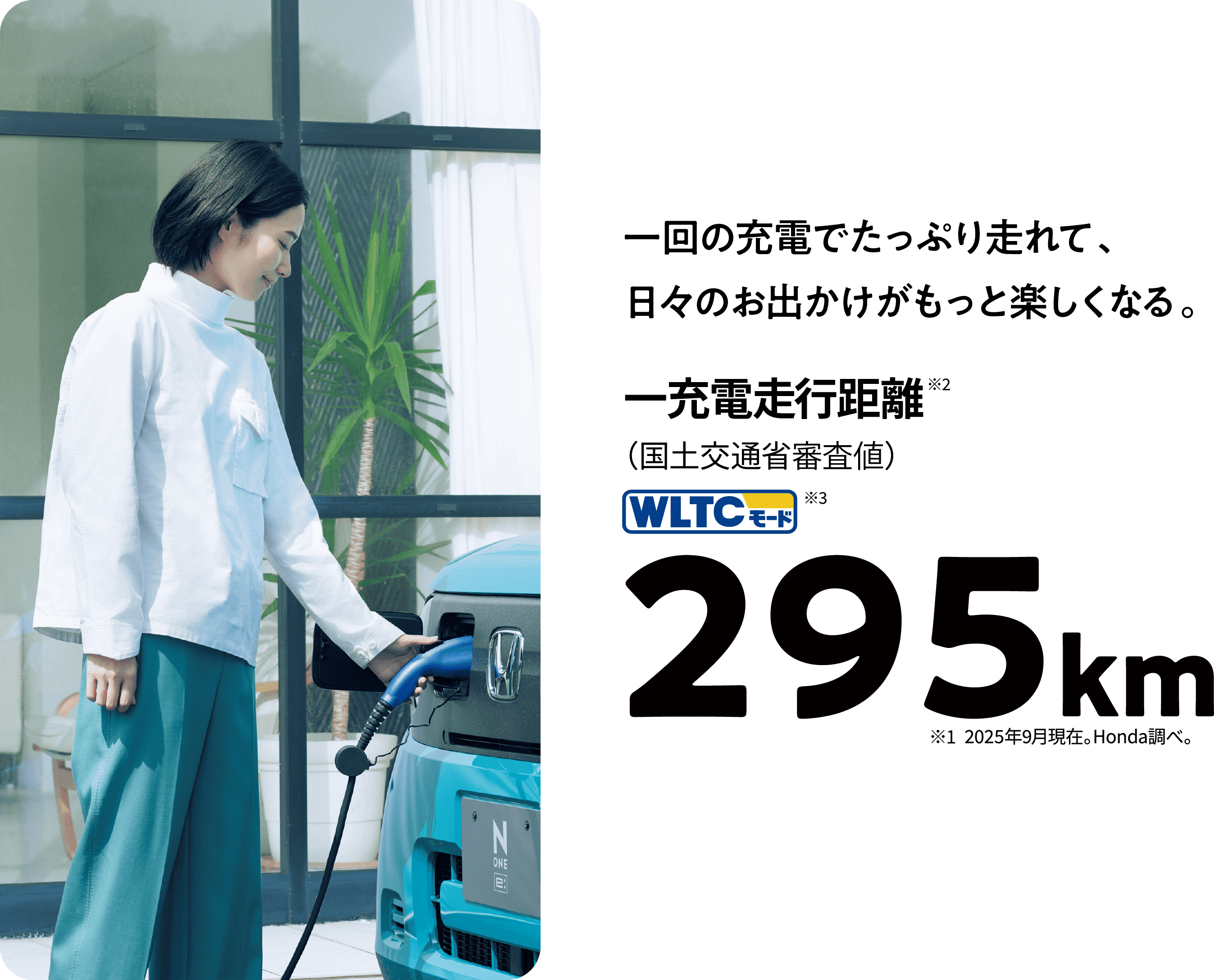 Photo: N-ONE e: L ボディーカラーはチアフルグリーン ディーラーオプション(充電ケーブル AC200V/16A ケーブル長15m)装着車 ■写真の充電ケーブルはディーラーオプション。 ※ 2 一充電走行距離は定められた試験条件での値です。お客様の使用環境(気象、渋滞等)や運転方法(急発進、エアコン使用等)に応じて一充電走行距離は大きく異なります。※ 3 WLTCモード:市街地、郊外、高速道路の各走行モードを平均的な使用配分で構成した国際的な走行モード。
