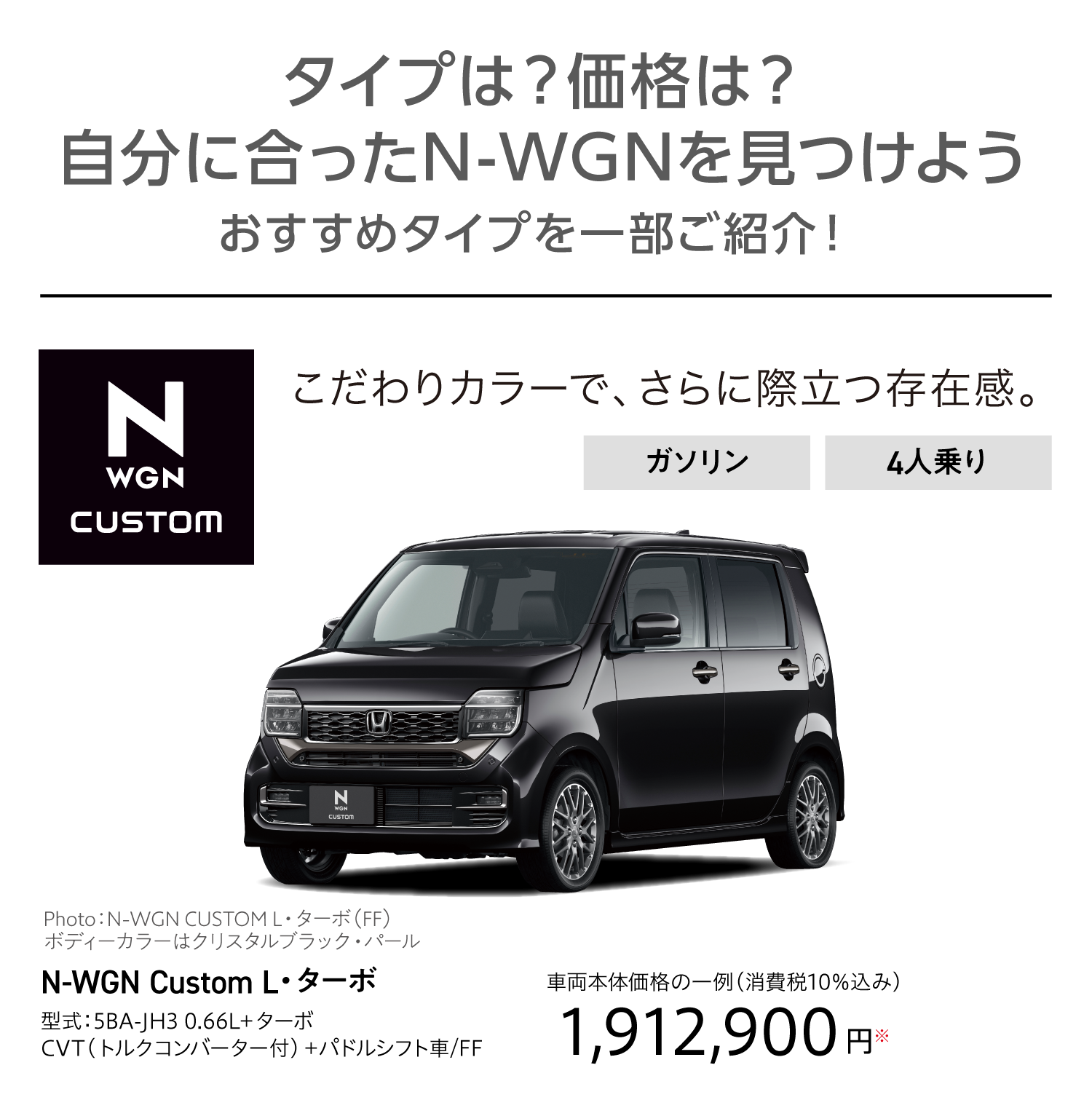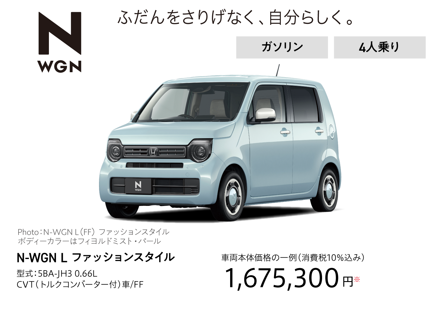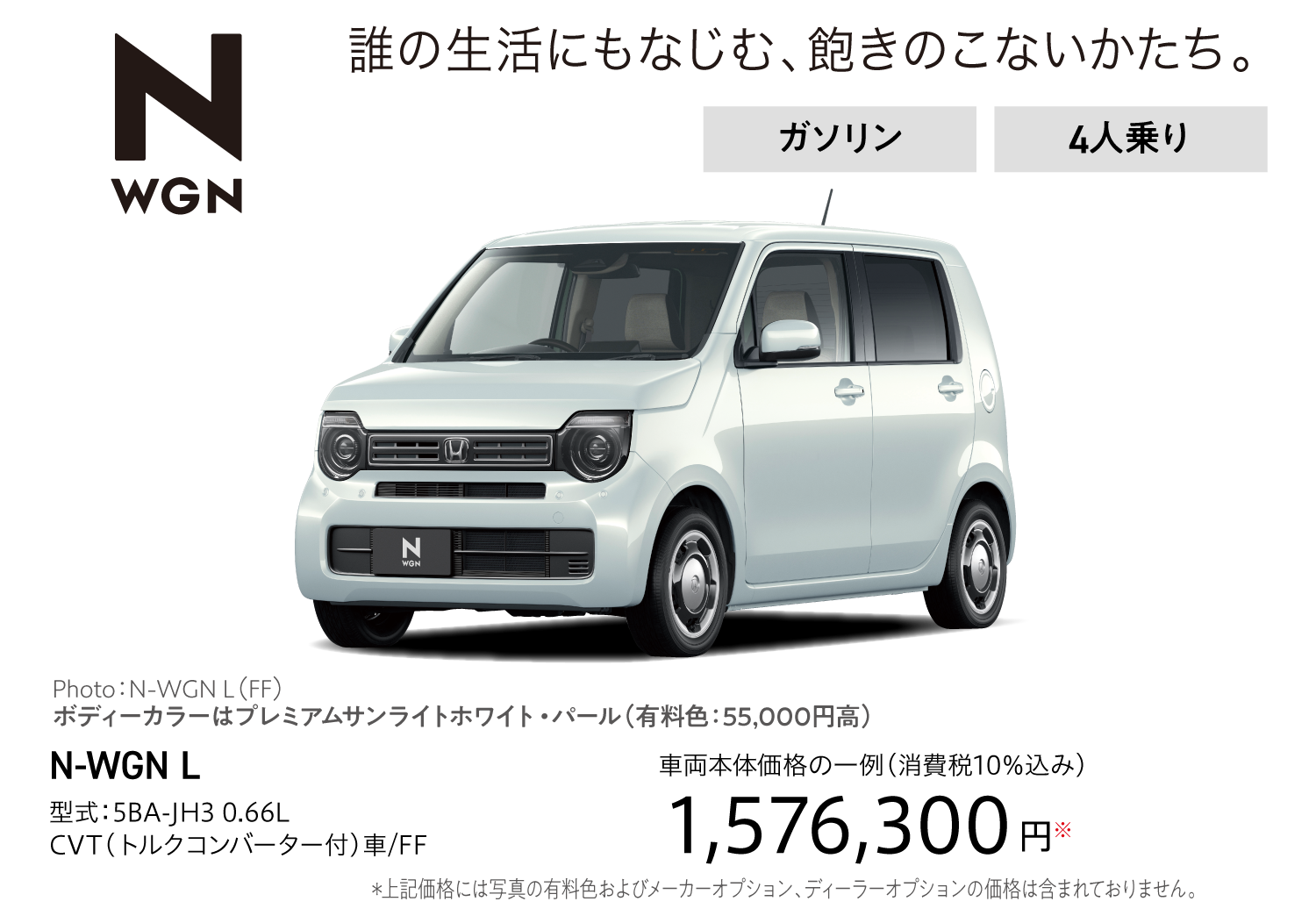 Photo①②:N-WGN L(FF)ボディーカラーはプレミアムサンライトホワイト・パール(有料色:55,000円高) ディーラーオプション(N-WGN/N-ONE 専用 9インチ プレミアム インターナビ LXU-247NBi 243,100円[取付アタッチメント、パネルキット、取付工賃別途])装着車 Photo③:N-WGN L(FF) ボディーカラーはプラチナホワイト・パール(有料色:33,000円高) Photo④:N-WGN L(FF) ボディーカラーはプラチナホワイト・パール(有料色:33,000円高) 小物類は撮影のために用意したものです。荷物のサイズ・形状によっては積めない場合があります。シートアレンジの各操作は、異物をはさんでないか確認の上、無理な力をかけず確実に行ってください。安全のため走行の際は荷物をしっかりと固定してください。