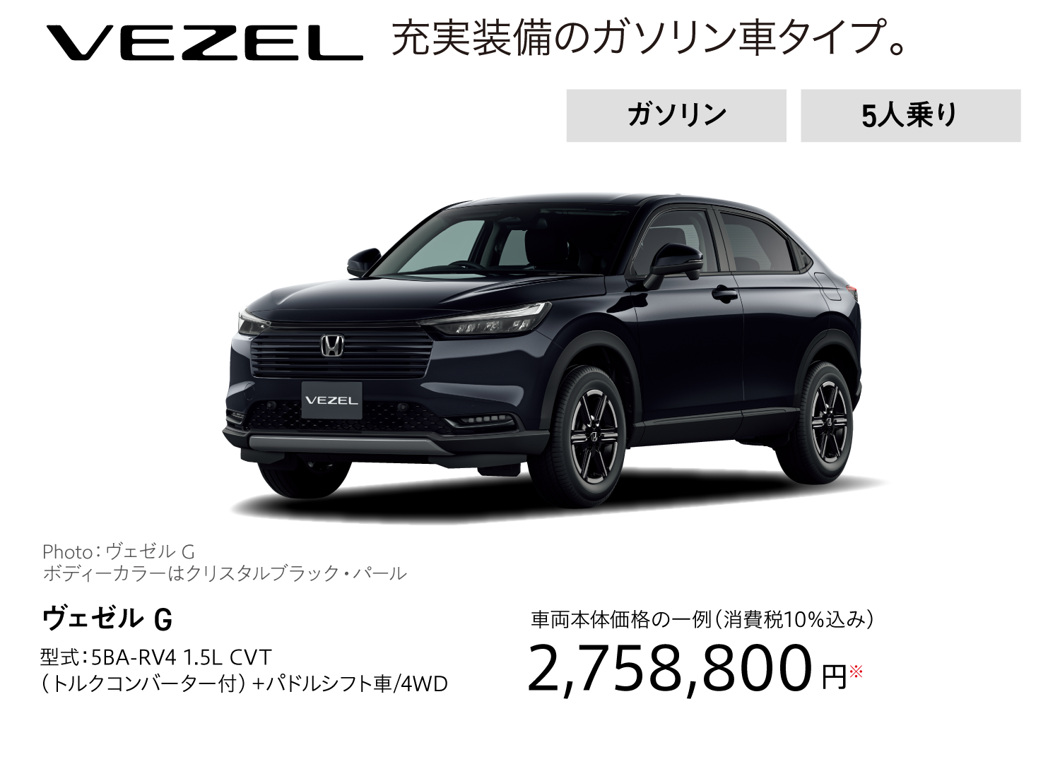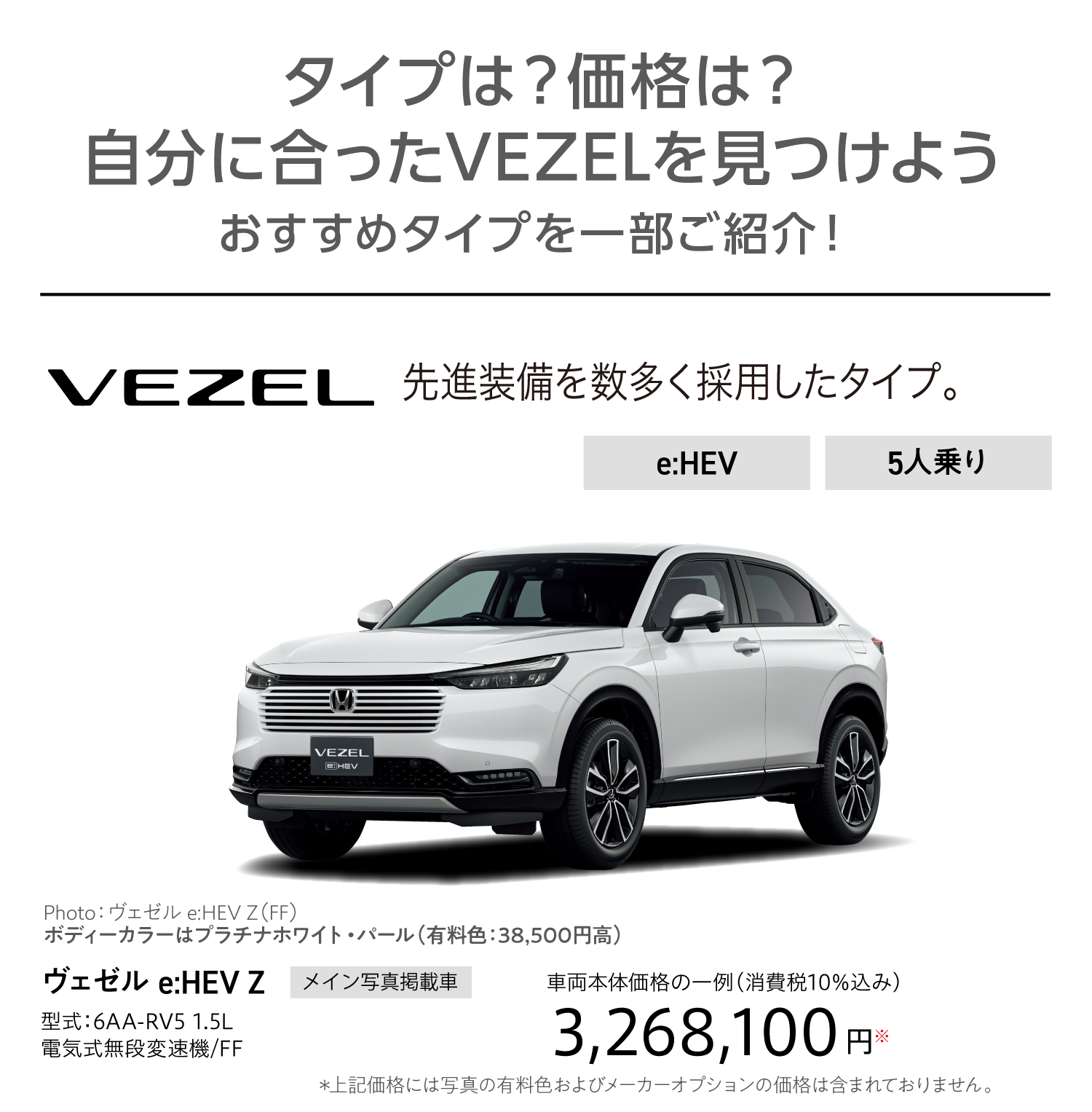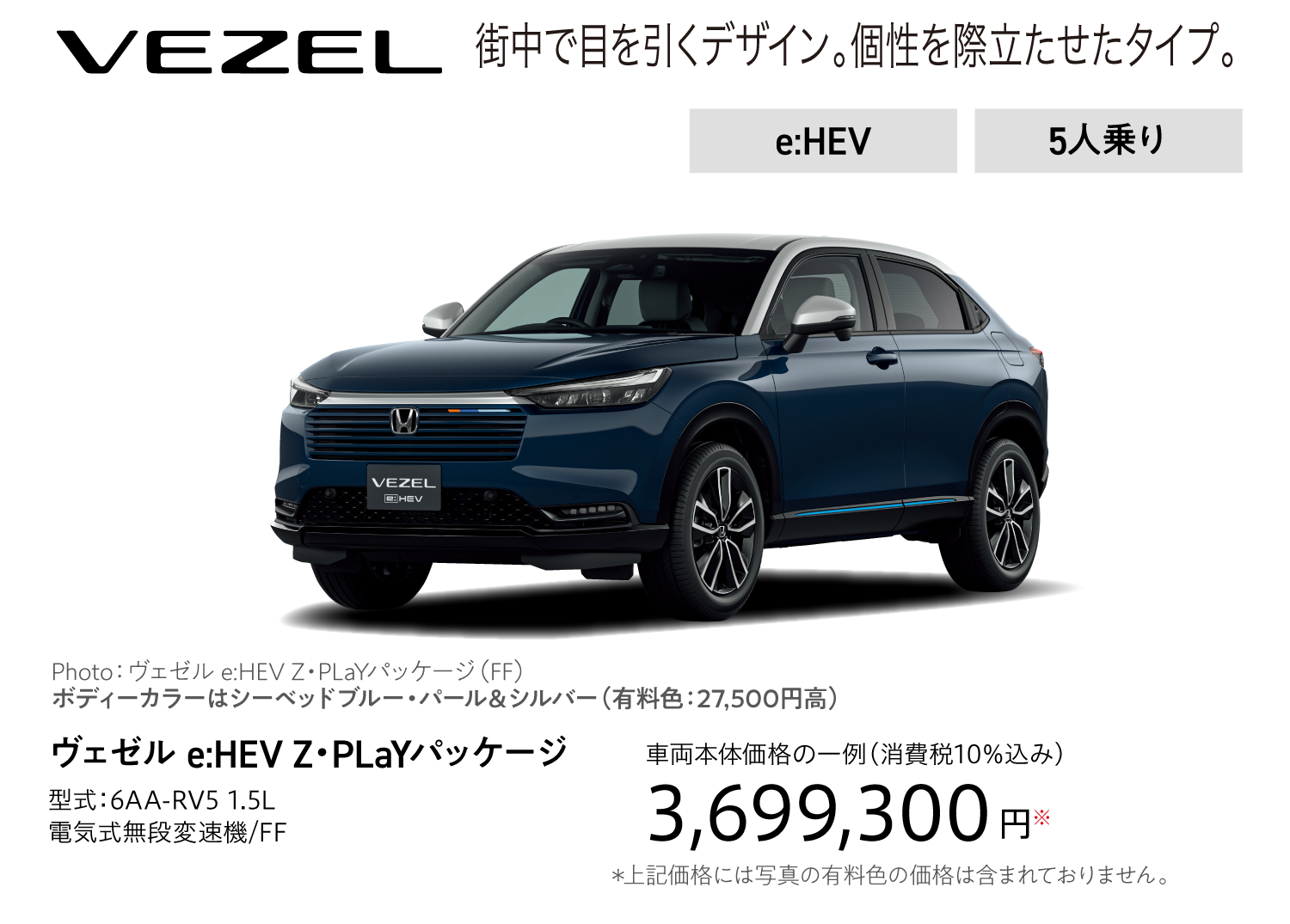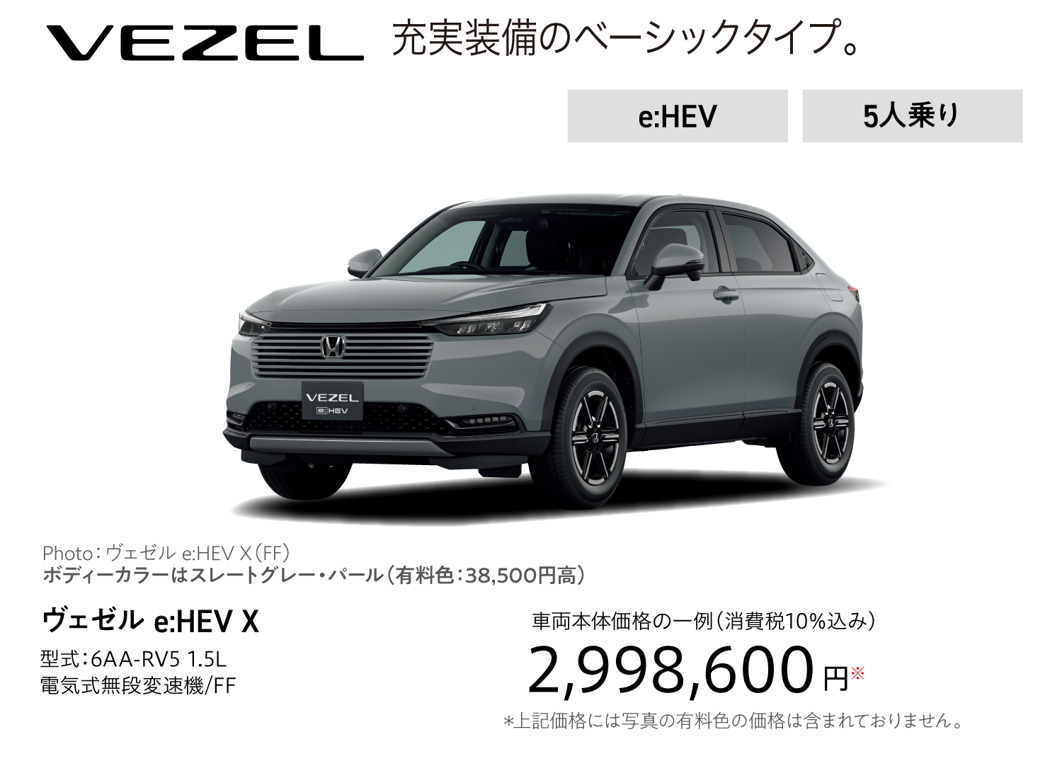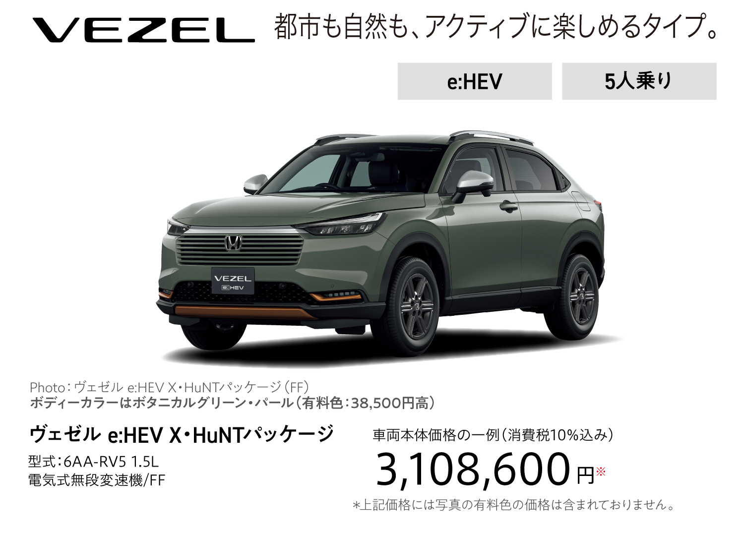 Photo①⑧⑨:ヴェゼル e:HEV X・HuNTパッケージ(FF)ボディーカラーはボタニカルグリーン・パール(有料色:38,500円高) Photo③:ヴェゼル e:HEV Z(FF)ボディーカラーはプラチナホワイト・パール(有料色:38,500円高)メーカーオプション(後退出庫サポート、Honda CONNECTディスプレー+ETC2.0車載器〈ナビゲーション連動〉、ワイヤレス充電器、マルチビューカメラシステム、プレミアムオーディオ347, 600円高)装着車 ●ETC2.0車載器を使用するには、別途決済用のETCカード、セットアップ作業(セットアップ費用)が必要となります。 Photo②:ヴェゼル e:HEV Z(FF)ボディーカラーはプラチナホワイト・パール(有料色:38,500円高)メーカーオプション(後退出庫サポート、Honda CONNECTディスプレー+ETC2.0車載器〈ナビゲーション連動〉、ワイヤレス充電器、マルチビューカメラシステム、プレミアムオーディオ 347,600円高)装着車 メーター類は撮影のため点灯。画面はハメコミ合成。●ETC2.0車載器を使用するには、別途決済用のETCカード、セットアップ作業(セットアップ費用)が必要となります。 Photo④:ヴェゼル e:HEV Z(FF)ボディーカラーはプラチナホワイト・パール(有料色:38,500円高) Photo⑤:ヴェゼル e:HEV Z(FF)ボディーカラーはプラチナホワイト・パール(有料色:38,500円高)小物類は撮影のために用意したものです。 Photo⑥:ヴェゼル e:HEV Z(FF)ボディーカラーはプラチナホワイト・パール(有料色:38,500円高)メーカーオプション(後退出庫サポート、Honda CONNECTディスプレー+ETC2. 0車載器〈ナビゲーション連動〉、ワイヤレス充電器220, 000円高)装着車 ●ETC2.0車載器を使用するには、別途決済用のETCカード、セットアップ作業(セットアップ費用)が必要となります。 Photo⑦:ヴェゼル e:HEV Z(4WD)車両本体価格の一例(消費税10%込み)3,488,100円※ *価格には写真の有料色の価格は含まれておりません。ボディーカラーはプラチナホワイト・パール(有料色:38,500円高)Photo⑩:ヴェゼル e:HEV X・HuNTパッケージ(FF)
