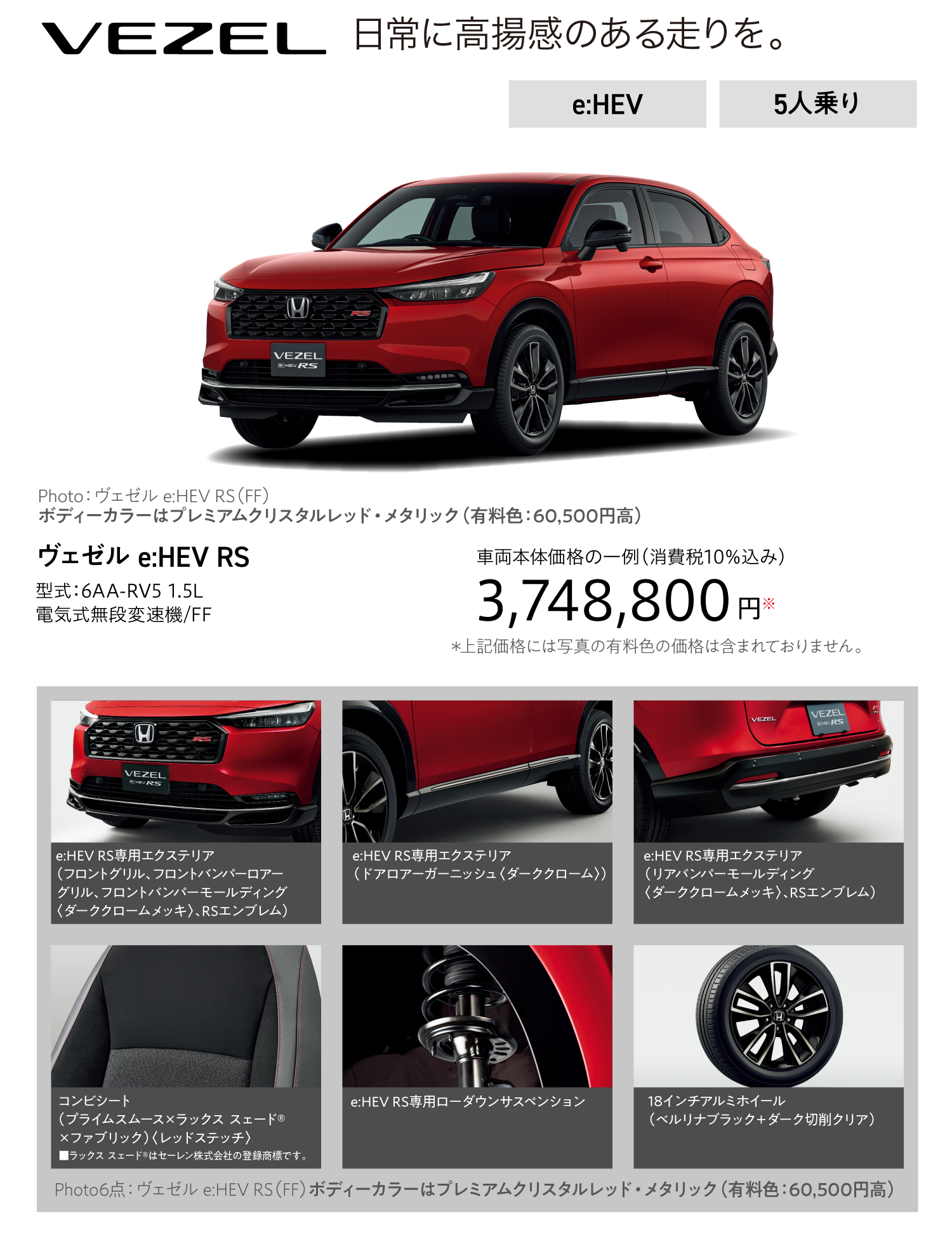 Photo①⑧⑨:ヴェゼル e:HEV X・HuNTパッケージ(FF)ボディーカラーはボタニカルグリーン・パール(有料色:38,500円高) Photo③:ヴェゼル e:HEV Z(FF)ボディーカラーはプラチナホワイト・パール(有料色:38,500円高)メーカーオプション(後退出庫サポート、Honda CONNECTディスプレー+ETC2.0車載器〈ナビゲーション連動〉、ワイヤレス充電器、マルチビューカメラシステム、プレミアムオーディオ 374,000円高)装着車 ●ETC2.0車載器を使用するには、別途決済用のETCカード、セットアップ作業(セットアップ費用)が必要となります。 Photo②:ヴェゼル e:HEV Z(FF)ボディーカラーはプラチナホワイト・パール(有料色:38,500円高)メーカーオプション(後退出庫サポート、Honda CONNECTディスプレー+ETC2.0車載器〈ナビゲーション連動〉、ワイヤレス充電器、マルチビューカメラシステム、プレミアムオーディオ 374,000円高)装着車 メーター類は撮影のため点灯。画面はハメコミ合成。●ETC2.0車載器を使用するには、別途決済用のETCカード、セットアップ作業(セットアップ費用)が必要となります。 Photo④:ヴェゼル e:HEV Z(FF)ボディーカラーはプラチナホワイト・パール(有料色:38,500円高) Photo⑤:ヴェゼル e:HEV Z(FF)ボディーカラーはプラチナホワイト・パール(有料色:38,500円高)小物類は撮影のために用意したものです。 Photo⑥:ヴェゼル e:HEV Z(FF)ボディーカラーはプラチナホワイト・パール(有料色:38,500円高)メーカーオプション(後退出庫サポート、Honda CONNECTディスプレー+ETC2. 0車載器〈ナビゲーション連動〉、ワイヤレス充電器 231,000円高)装着車 ●ETC2.0車載器を使用するには、別途決済用のETCカード、セットアップ作業(セットアップ費用)が必要となります。 Photo⑦:ヴェゼル e:HEV Z(4WD)車両本体価格の一例(消費税10%込み)3,488,100円※ *価格には写真の有料色の価格は含まれておりません。ボディーカラーはプラチナホワイト・パール(有料色:38,500円高)Photo⑩:ヴェゼル e:HEV X・HuNTパッケージ(FF)