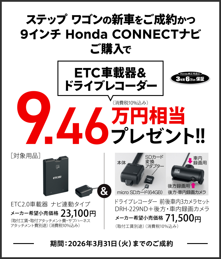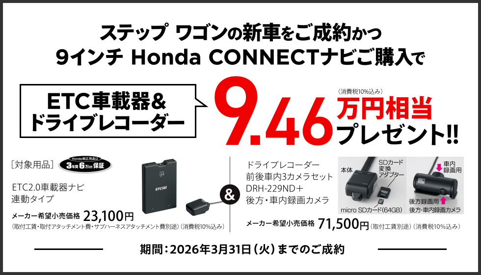 ●キャンペーンはステップ ワゴンを新車でご成約かつHonda純正用品の9インチ Honda CONNECTナビ LXM-242ZFNi(メーカー希望小売価格207,900円(消費税10%込み)(取付工賃・取付アタッチメント費・パネルキット費・サブパネルキット費別途))をご購入の方が対象となります。 ●プレゼントはご成約いただいた販売店でのみ有効です。 ●プレゼントはご成約された車を対象として取付けします。 ●取付工賃、取付アタッチメント費、サブハーネスアタッチメント費、ETCセットアップ費等が別途必要となります。 ●ETC車載器を使用するには、別途決済用のETCカードが必要となります。 ●価格はメーカー希望小売価格(消費税10%込み)で参考価格です。販売価格は販売会社が独自に定めております。 ●当キャンペーン権利の他人への譲渡や換金、値引きはできません。 ●他のキャンペーンと併用できない場合があります。 ●一部のタイプ、カラーによっては登録に時間を要するため対象とならない場合がございます。 ●詳しくは販売会社までお問い合わせください。