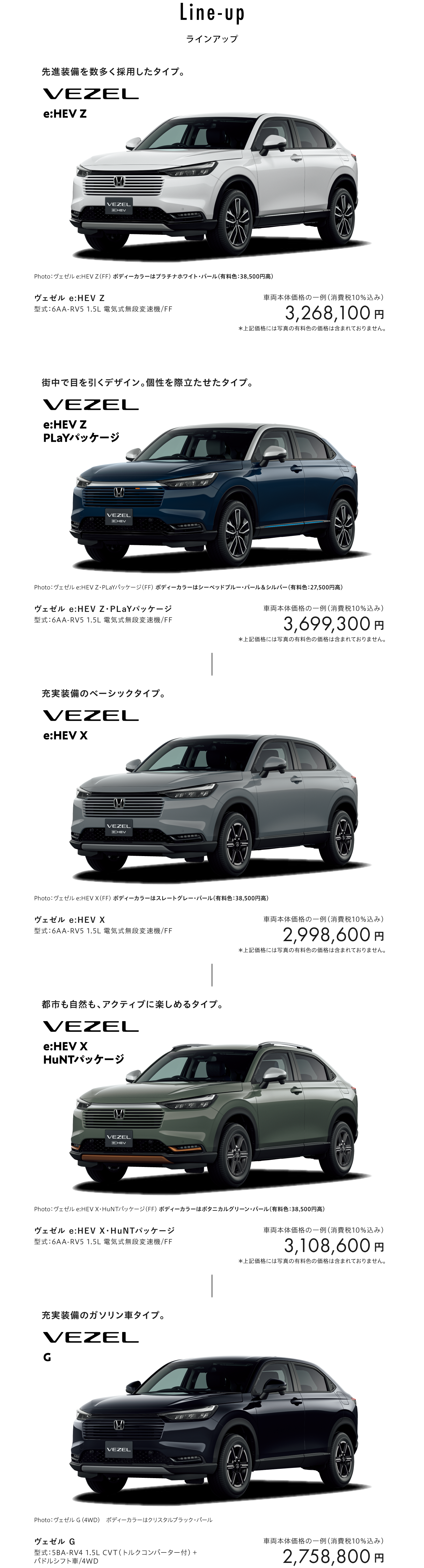 Photo①②③:ヴェゼル e:HEV Z(FF) ボディーカラーはプラチナホワイト・パール(有料色:38,500円高)メーカーオプション(後退出庫サポート、Honda CONNECTディスプレー+ETC2.0車載器〈ナビゲーション連動〉、ワイヤレス充電器、マルチビューカメラシステム、プレミアムオーディオはセットで347,600円高)装着車 ■メーター類は撮影のため点灯。■画面はハメコミ合成。●ETC2.0車載器を使用するには、別途決済用のETCカード、セットアップ作業(セットアップ費用)が必要となります。